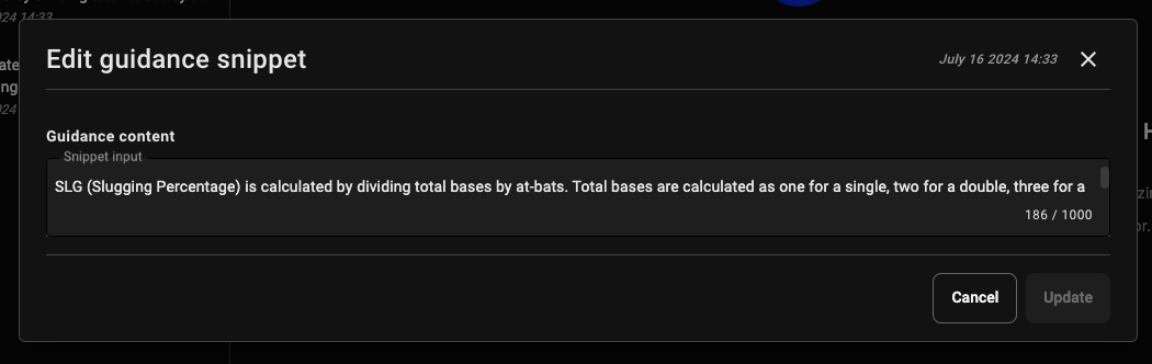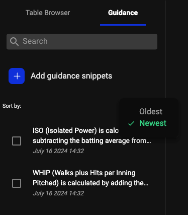 Guidance snippets can be sorted by oldest or newest updated date from the “Sort by” menu.
