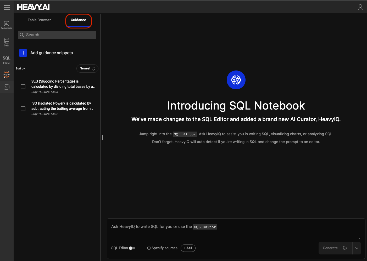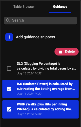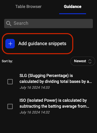 You can access the Guidance panel by clicking the “Guidance” tab in SQL Notebook. The Guidance panel displays a list of all guidance snippets associated with the current database, and allows superusers to create, edit, or delete snippets.