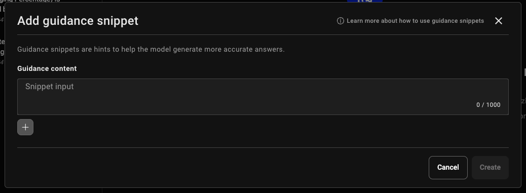 Guidance snippets are hints, tips, formulas or acronym explanations which you can optionally provide to the HeavyIQ language model. They are particularly useful in describing things which are not known to the base model but are important in your particular analytical domain. For example, the acronym TVD can stand for many different things, including “total variation distance” in statistics. But in the Oil and Gas industry, it stands for “true vertical depth.” Similarly, you may have industry or even company-specific KPIs or key performance indicators. These are all good candidates for inclusion as guidance snippets.