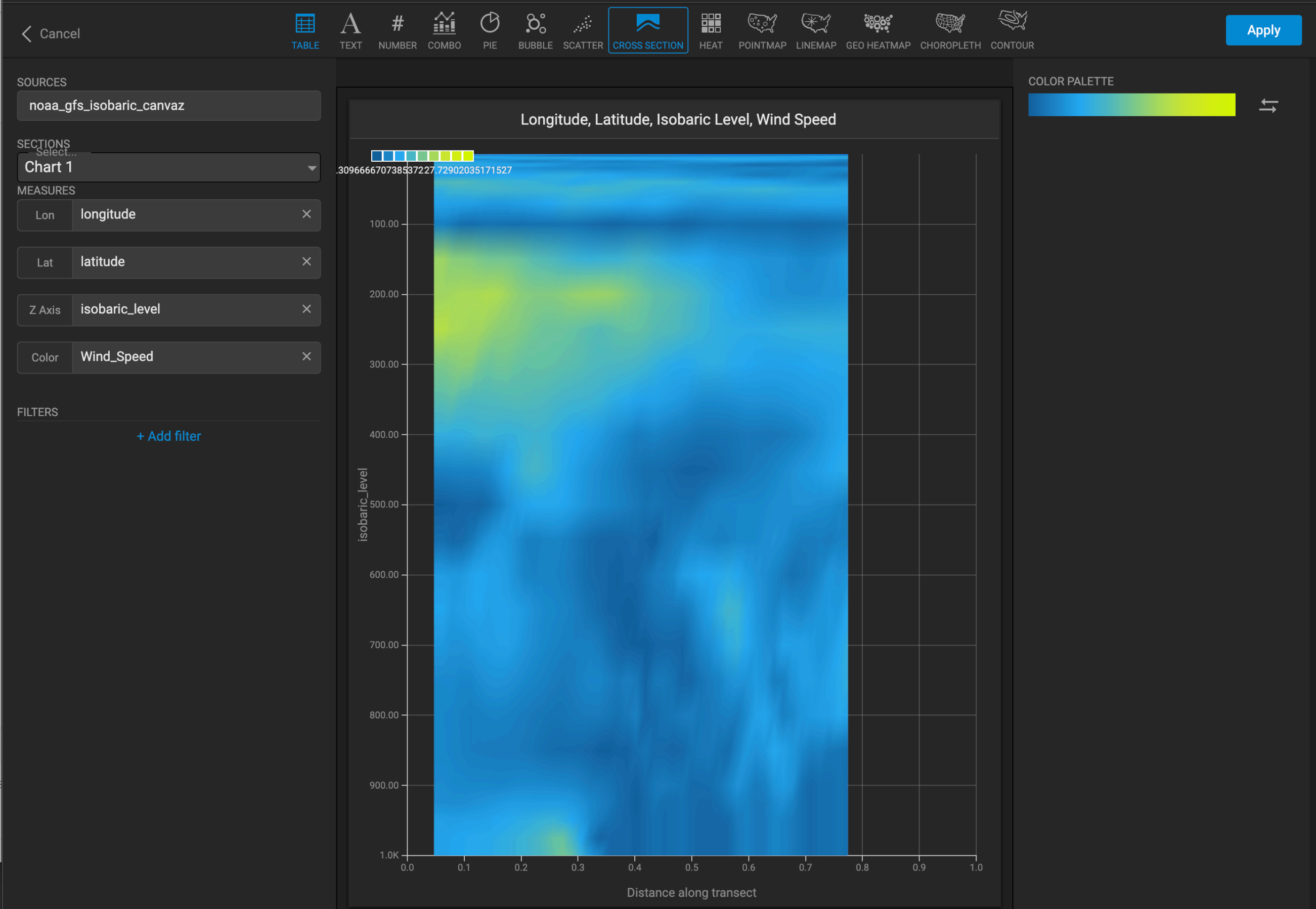 A cross section is slightly more difficult to specify than some other chart types because there can be a nearly-infinite number of cross sections drawn within a volume. The location of the sections must be specified on a map chart, and the line tool provides a simple and quick way of doing so. The visualization properties of the section are set in the contour chart itself. You can add the charts in any order, but you must have a map chart on your dashboard before you can complete the full specification of an interactive cross-section.