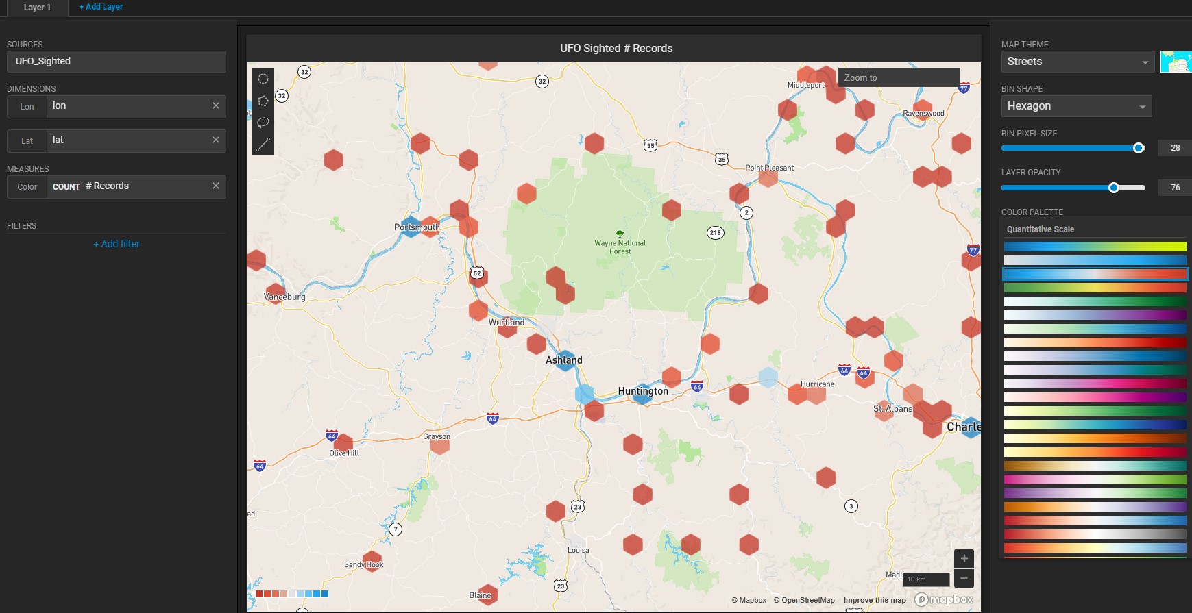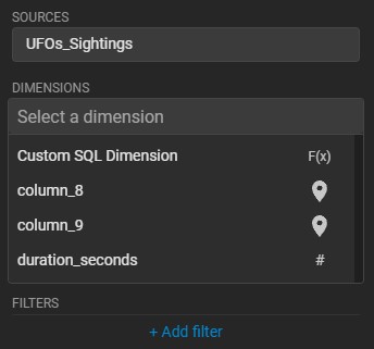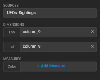 Create a new Geo Heatmap. This example uses the **UFO\_Sighted** as the **Data Source**. Set the dimensions to **lon** and **lat**. Set the measure to **COUNT # Records**.