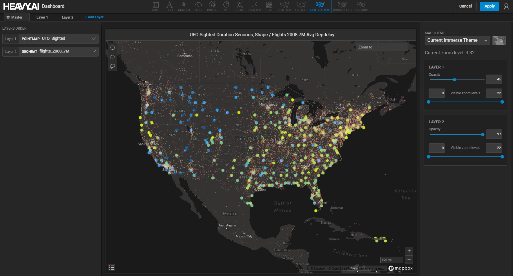 The resulting chart compares a Geo Heatmap of flight departure delays to a Pointmap of UFO sightings.