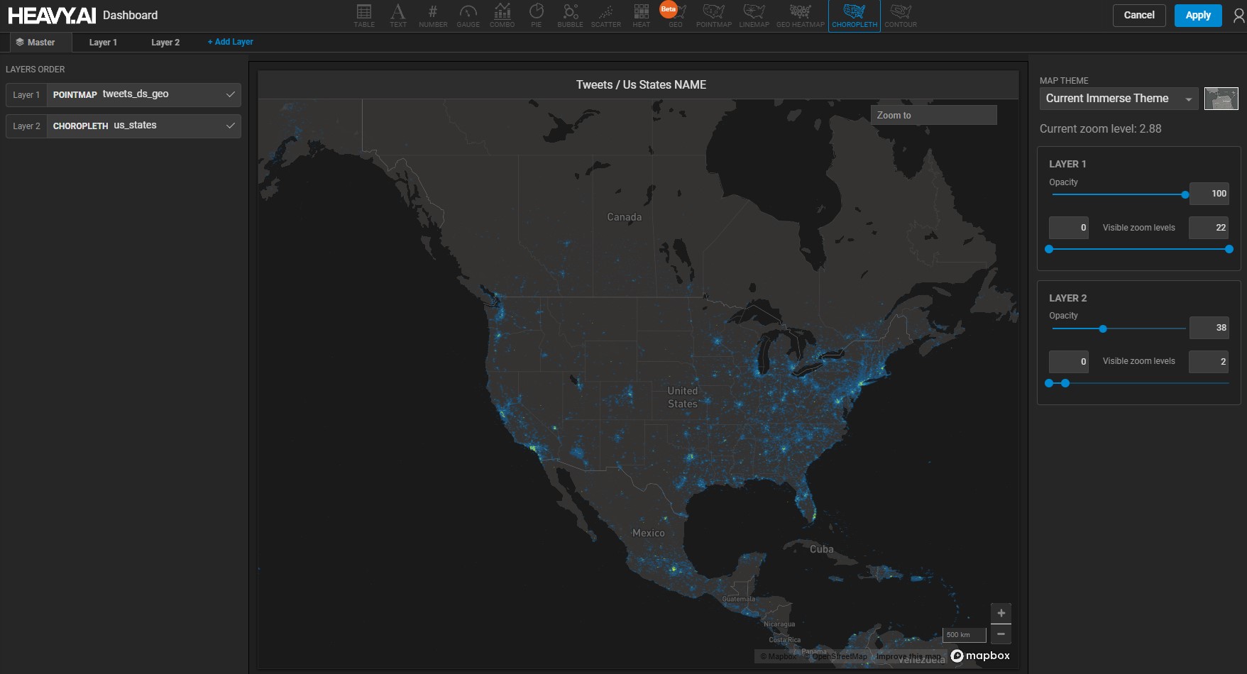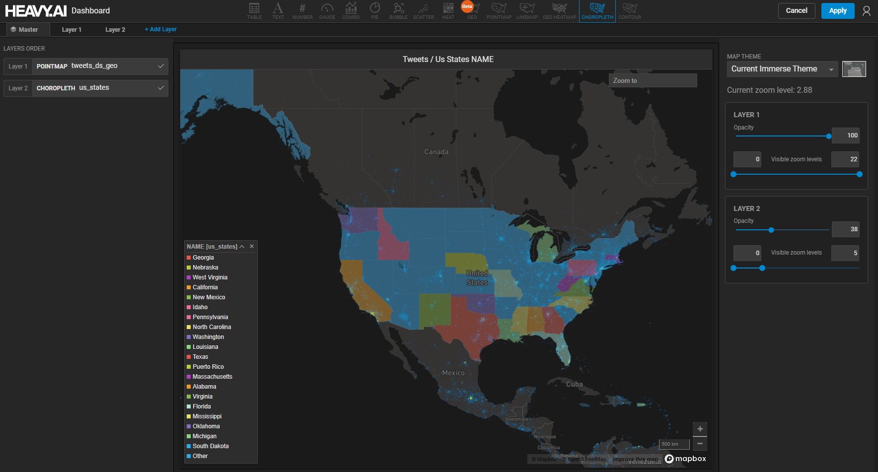 This chart has two layers: a Pointmap based on tweets and a Choropleth based on 14 states defined by name, with the rest defined as Other. Currently, the chart is zoomed to level 5.
