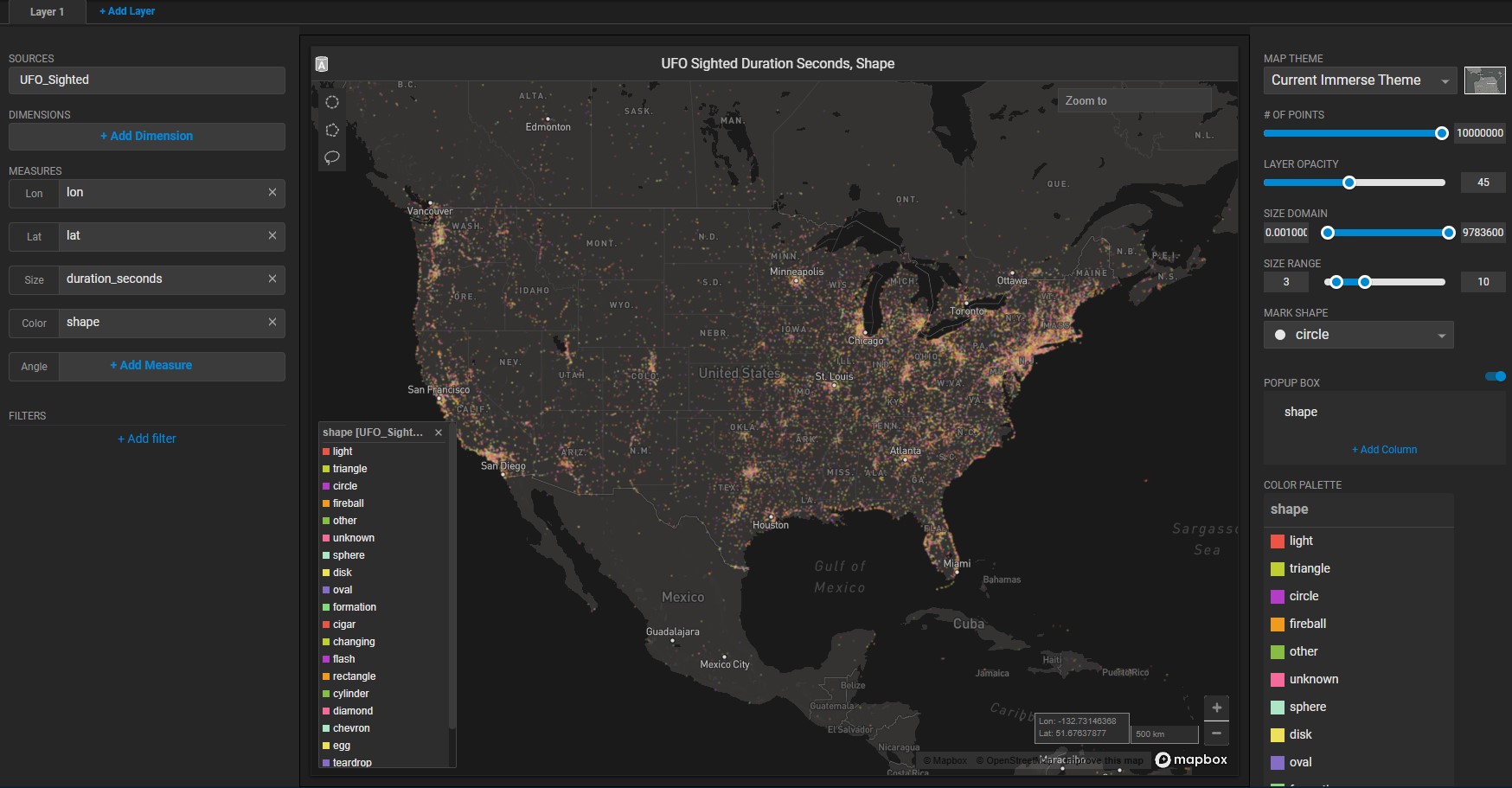 Set the **Lon** measure to longitude and **Lat** measure to latitude. Set the **Size** measure to duration\_seconds. Set the **Color** measure to shape.