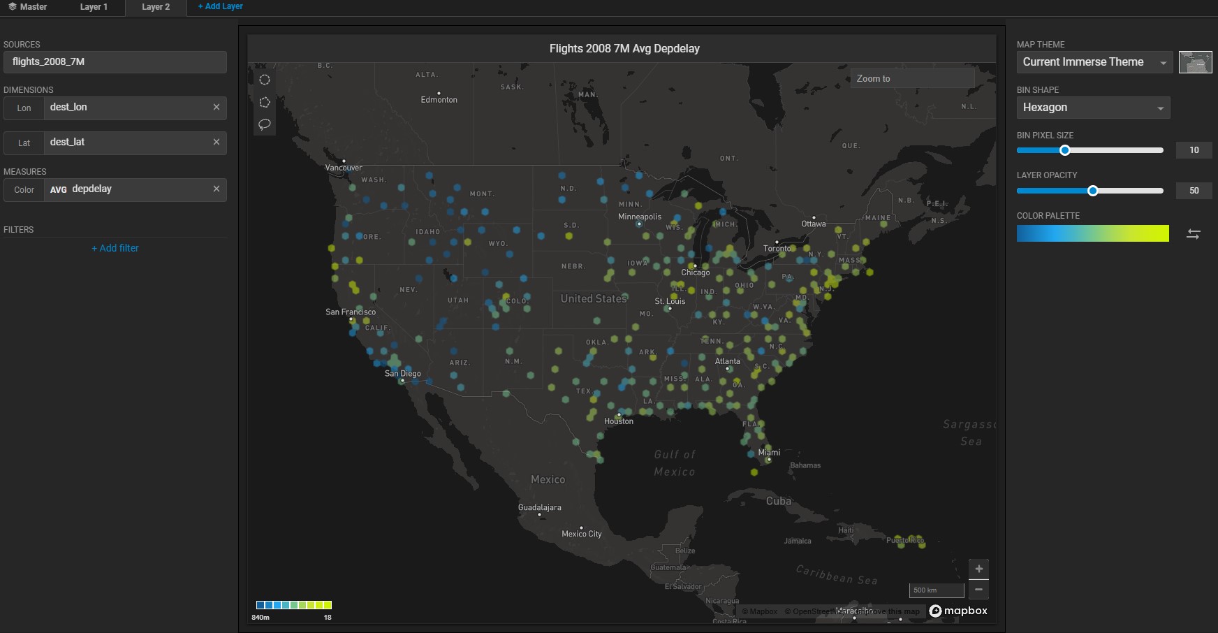 Click the **Add Layer** tab, and create a Geo Heatmap. Set the data source to the flights\_2008\_7M database. Set **Lon** to dest\_lon and **Lat** to dest\_lat. Set the **Color** measure to AVG depdelay.