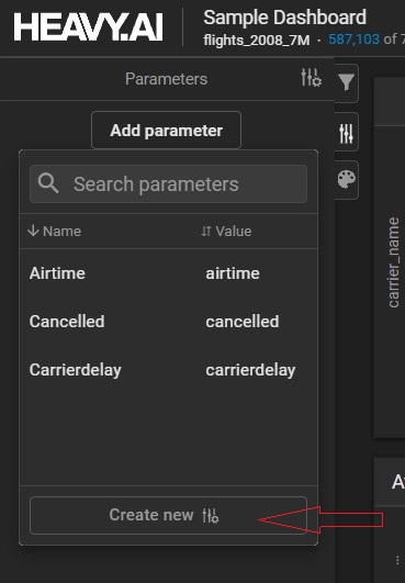 If you click **Add parameter** in a dashboard that has existing parameters, the parameters that have been created for that dashboard are listed. To create a new parameter, click **Create new** at the bottom of the parameters list, or click the **Open parameters manager** icon.