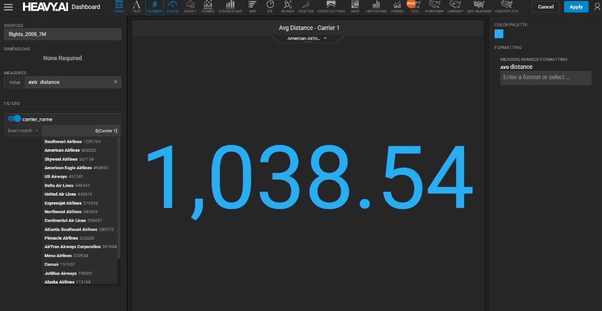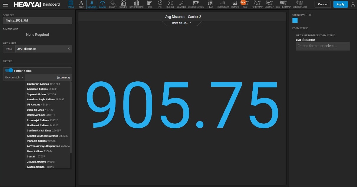 For example, changing the name of the carrier in the parameter affects all charts on the tab. Here, Carrier 1 is changed to Alaska and Carrier 2 is changed to United. You can see how values have changed across all charts.