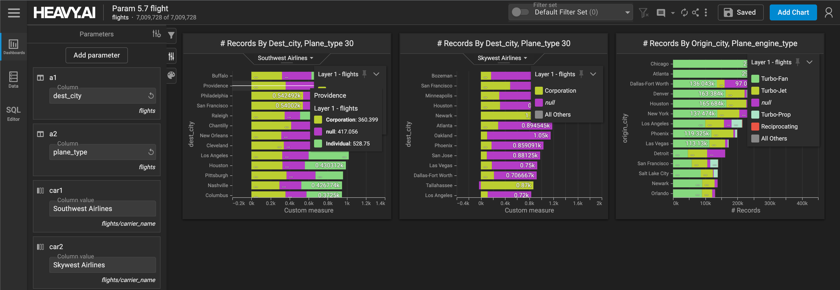 The dashboard shows two identical charts, but the chart created with parameters has some advantages. For example, you can change the Base and Group-by dimensions without editing the chart. Here, the column in parameter a1 is changed to destination city and the column in parameter a2 is changed to plane type: