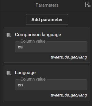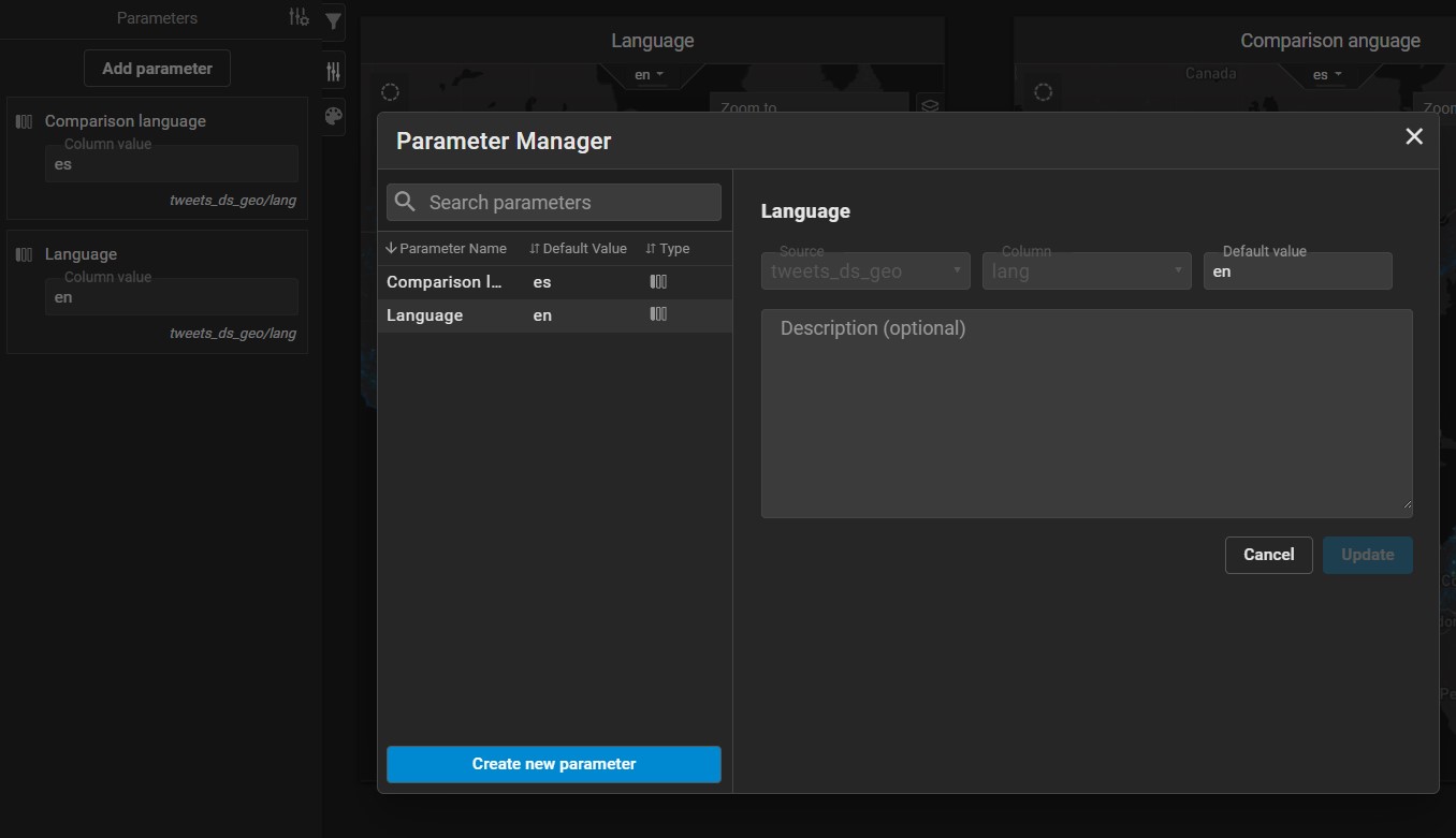 You can also see the details for these parameters by opening the Parameters Manager. Here, the Language parameter is selected. The left column shows all of the parameters used on the dashboard.