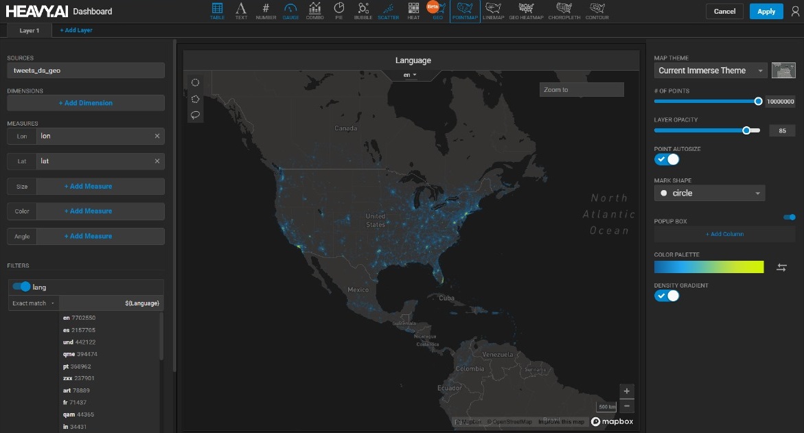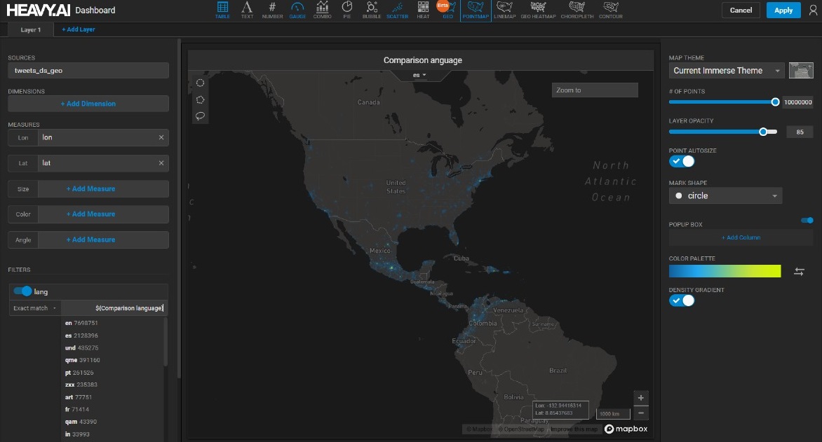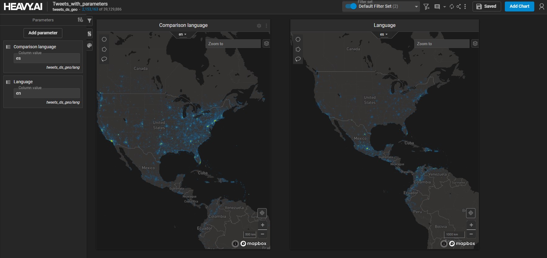 This simple example shows maps of tweets for different languages and uses parameters to change languages and make comparisons.