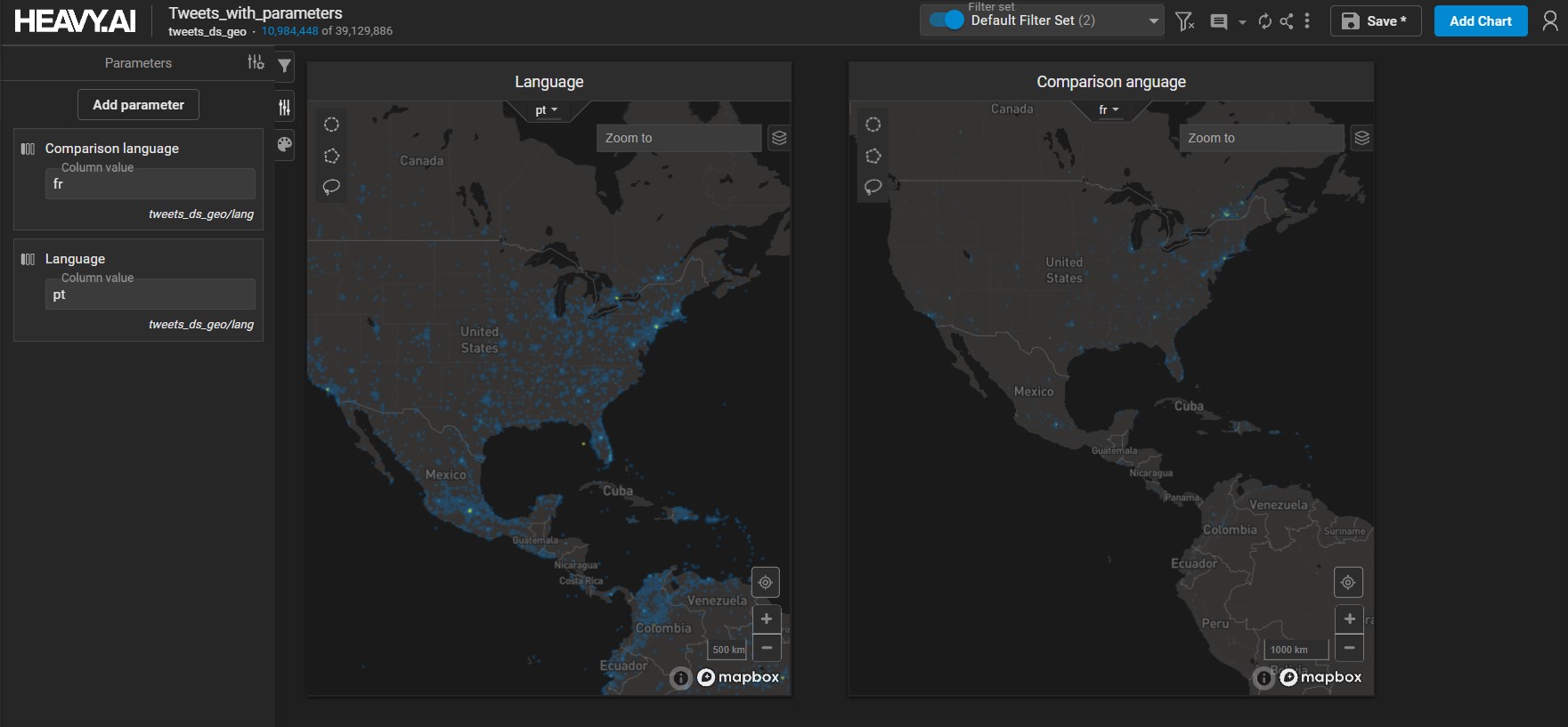 Instead of opening the chart to make changes to the language displayed, you can make those changes in parameters. For example, the following dashboard tab shows Language as Portuguese (pt) and Comparison Language as French (fr), with geographical concentrations appearing where you might expect.