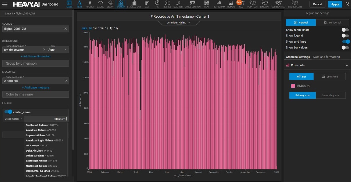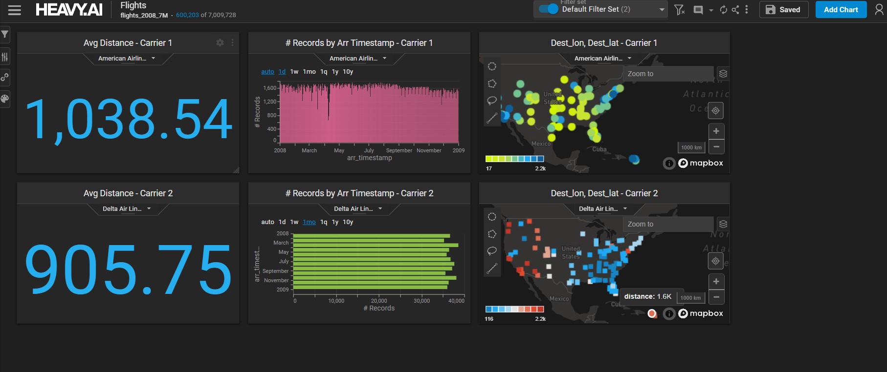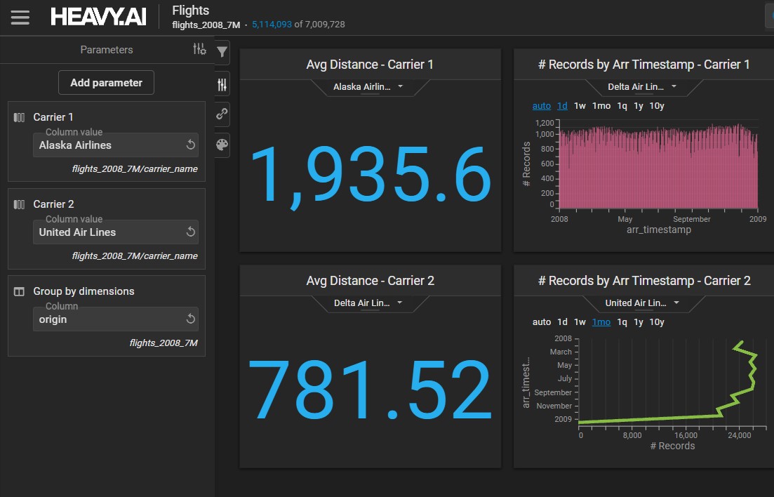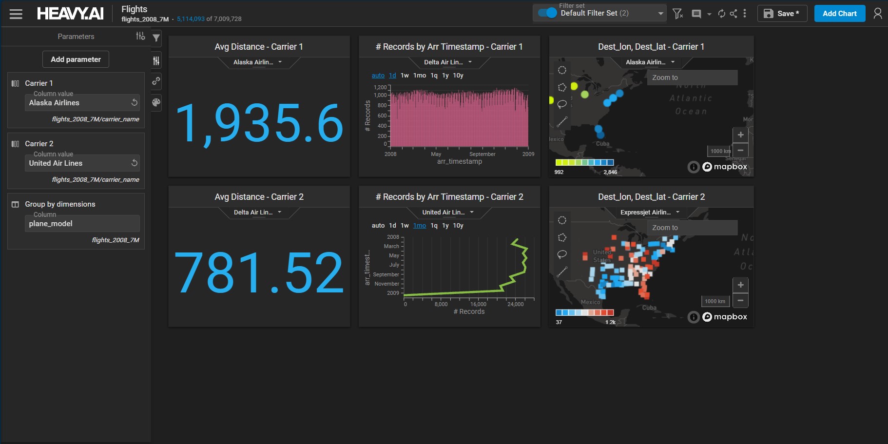 Now the charts use filters defined with parameters. You can change the parameter values to make comparisons between different carriers.