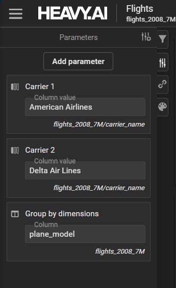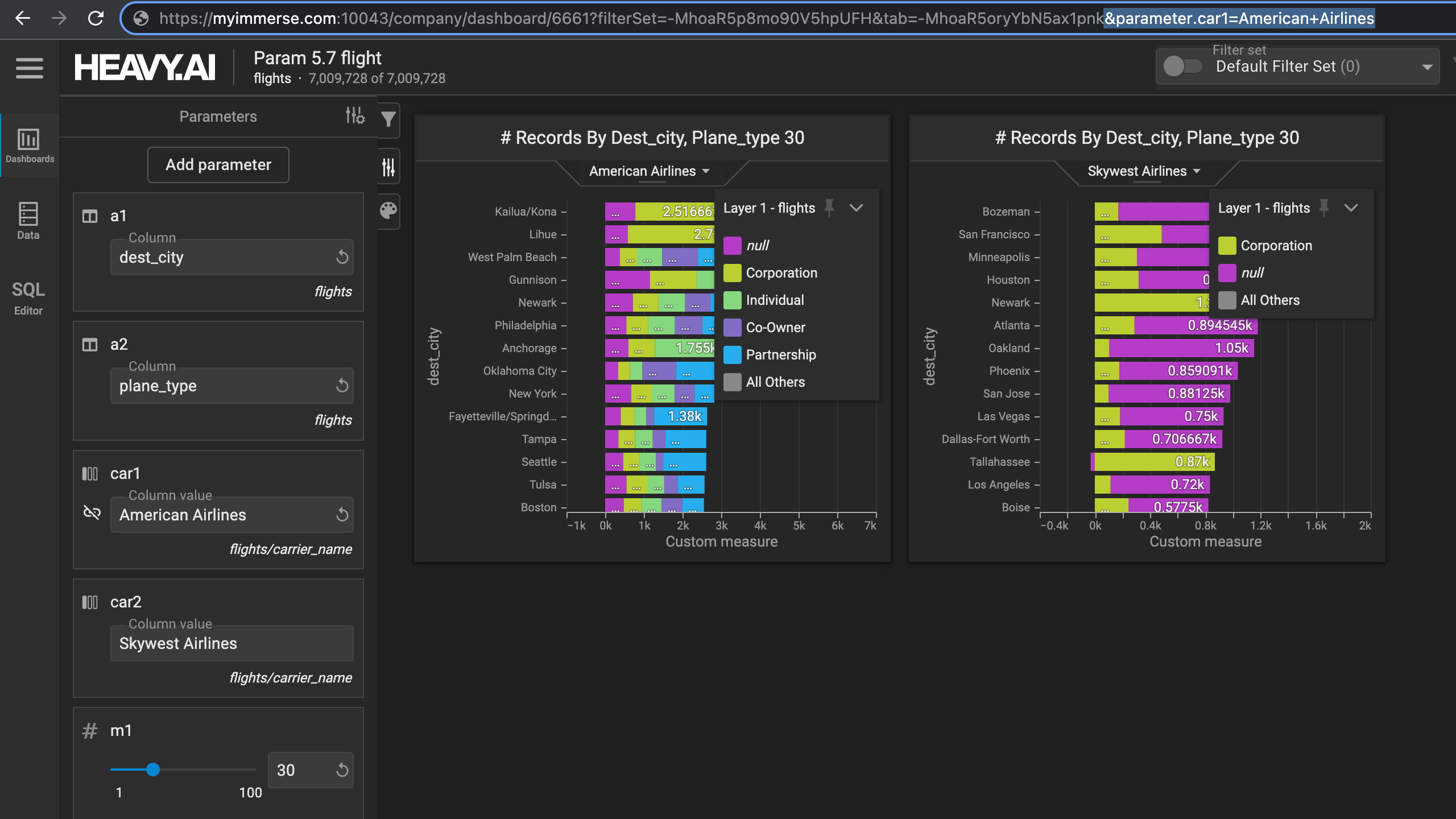If you want to open a version of the dashboard where **car1** is defined as American Airlines instead of the default Southwest Airlines, you can append **\&parameter.car1=American+Airlines** to the URL: