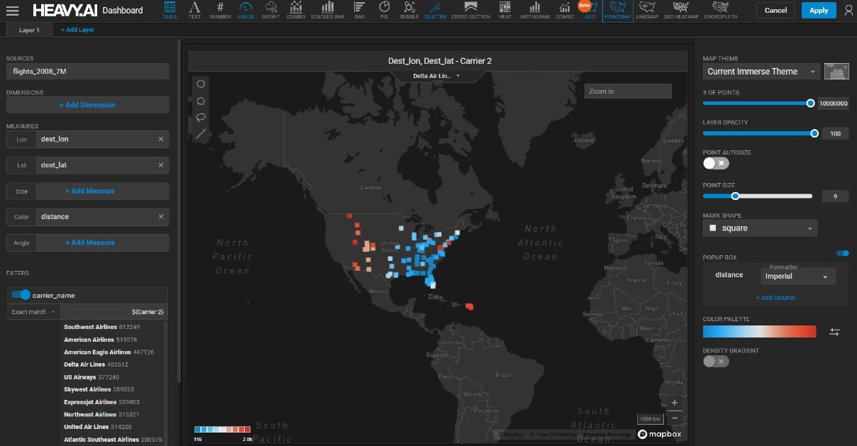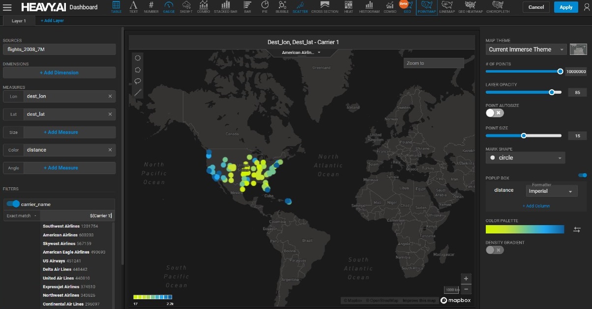 This example shows a flight origin and destination chart that you can create, change, and analyze using parameters.