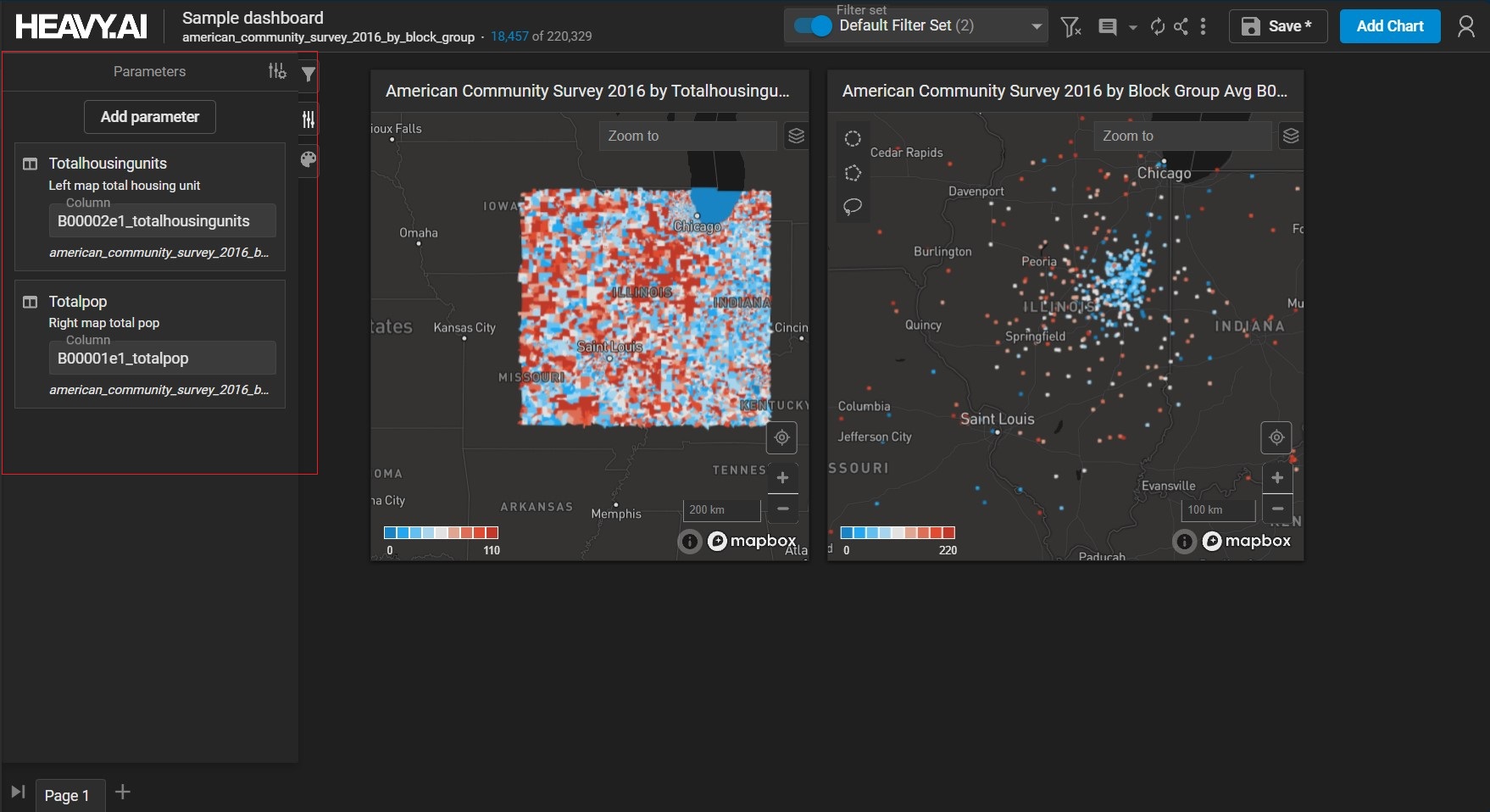 The following figure shows the Parameters pane on the dashboard. The parameters defined (**Left Map Display** and **Right Map Display**) enable you to change values that previously could only be altered at the individual chart level.