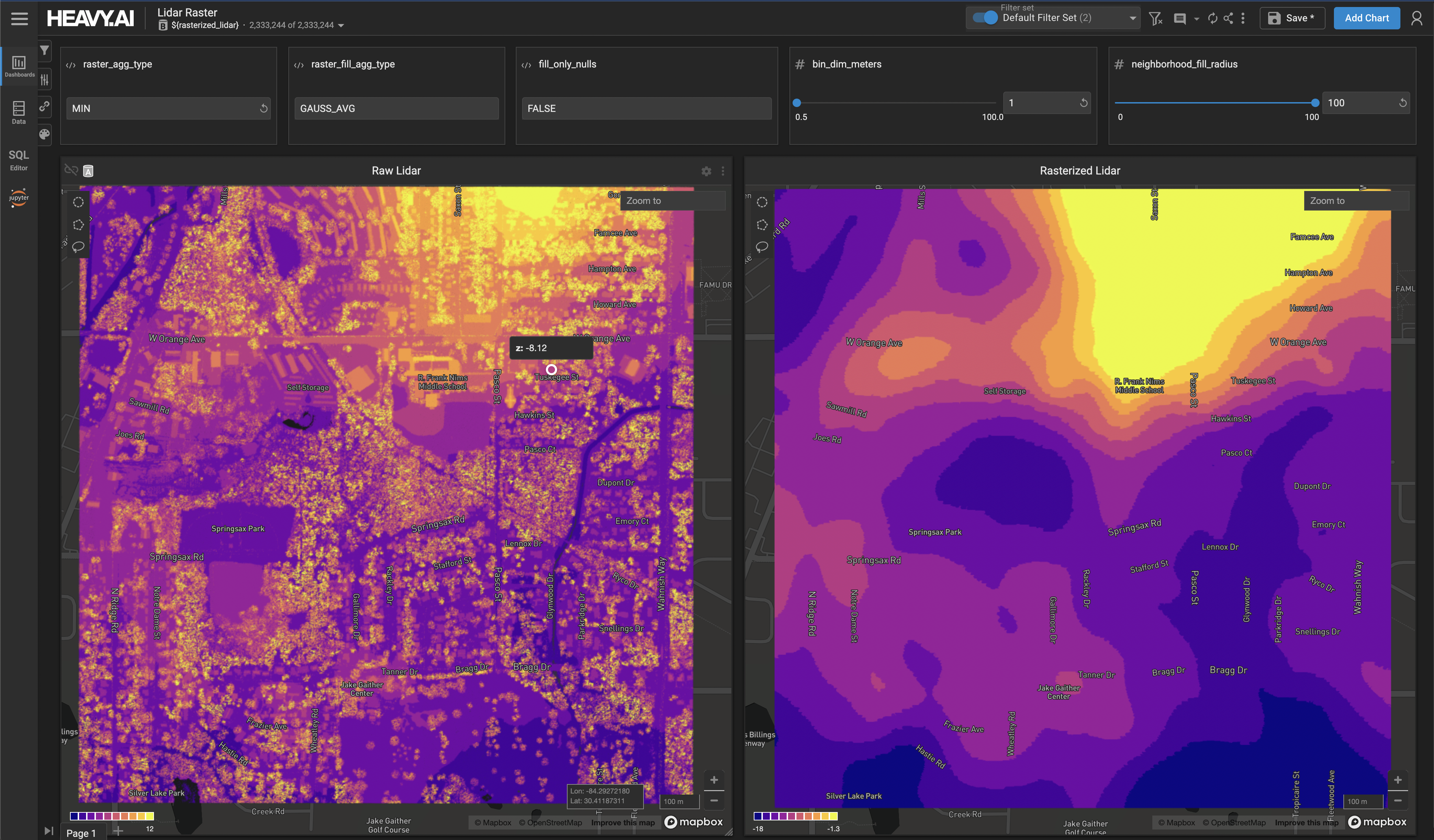 <figure><img src="https://875484548-files.gitbook.io/~/files/v0/b/gitbook-x-prod.appspot.com/o/spaces%2FgWRc88gdQeZ7mRBB46Rx%2Fuploads%2Fgit-blob-9de0c3e8e6d89e37b6b8392e76588c83f1f8022a%2Fgeo_rasterize.png?alt=media" alt=""><figcaption><p>Heavy Immerse dashboard showing a raw Tallahasse LiDAR dataset on the left, and a smoothed version on the right using the min z values for each 1-meter binned cell of the LiDAR data, Gaussian-smoothed over the neighboring 100 cells.</p></figcaption></figure>