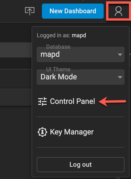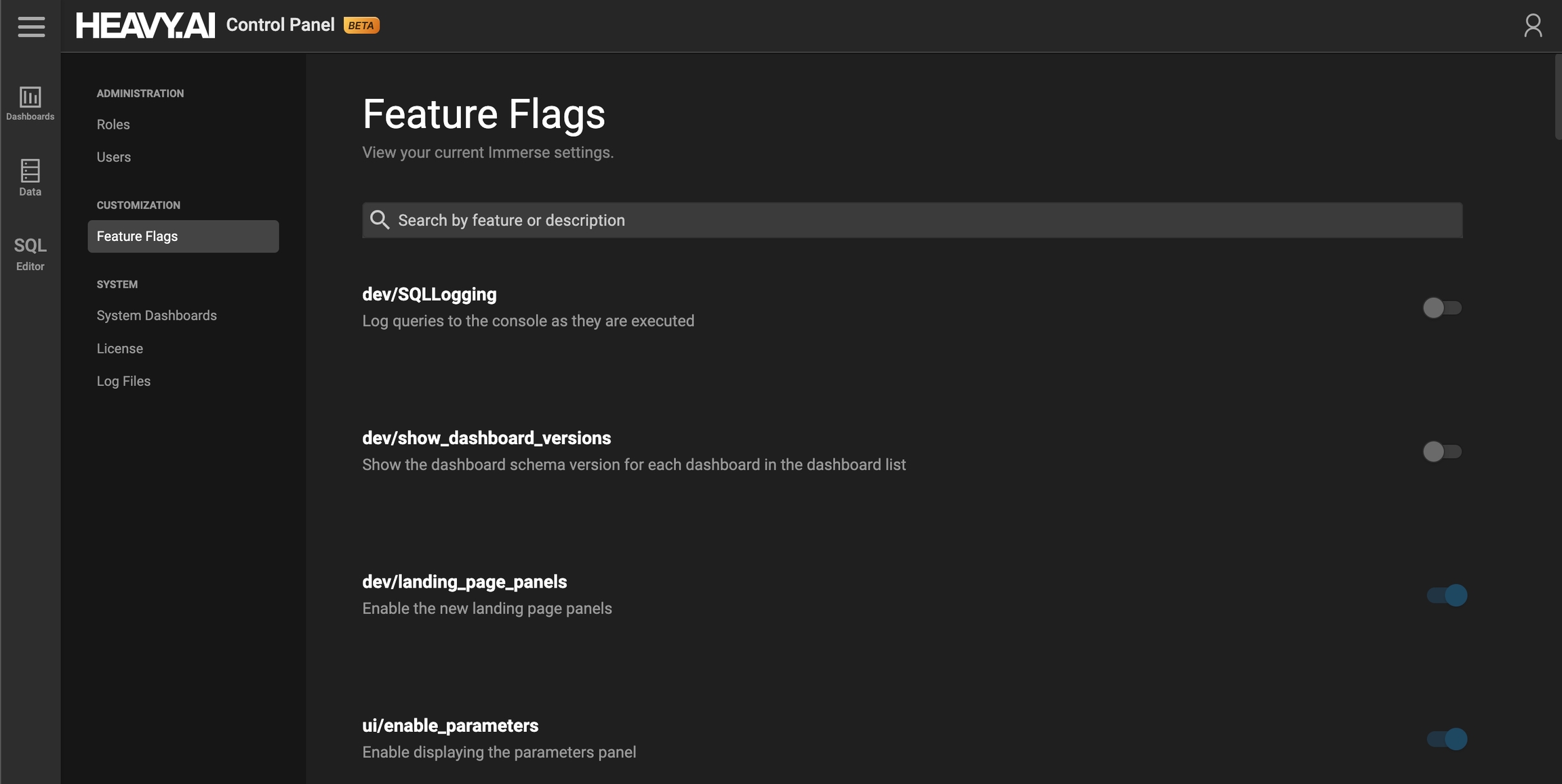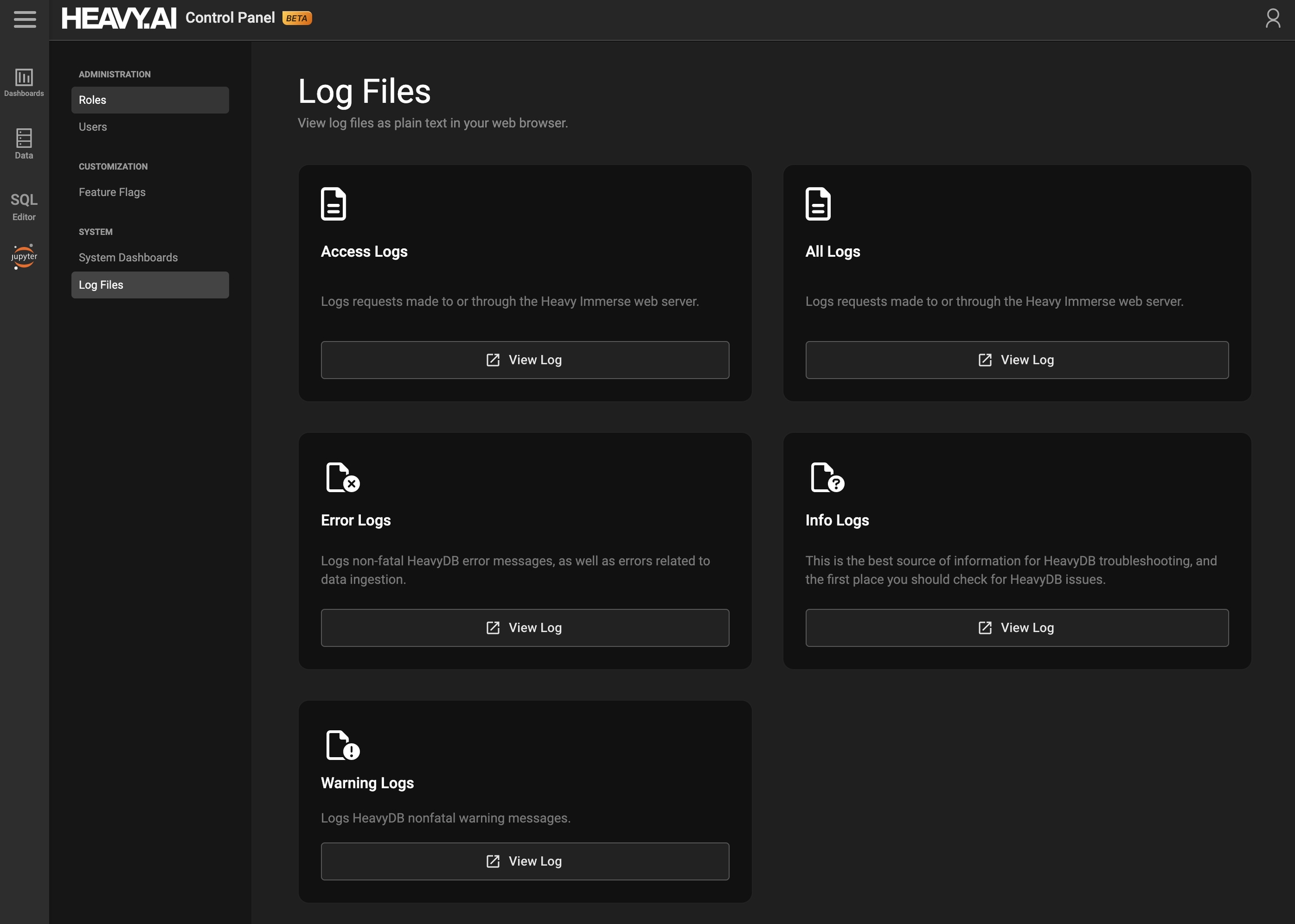 The Control Panel gives super users visibility into roles and users of the current database, as well as feature flags, system table dashboards, and log files for the current HeavyDB instance.
