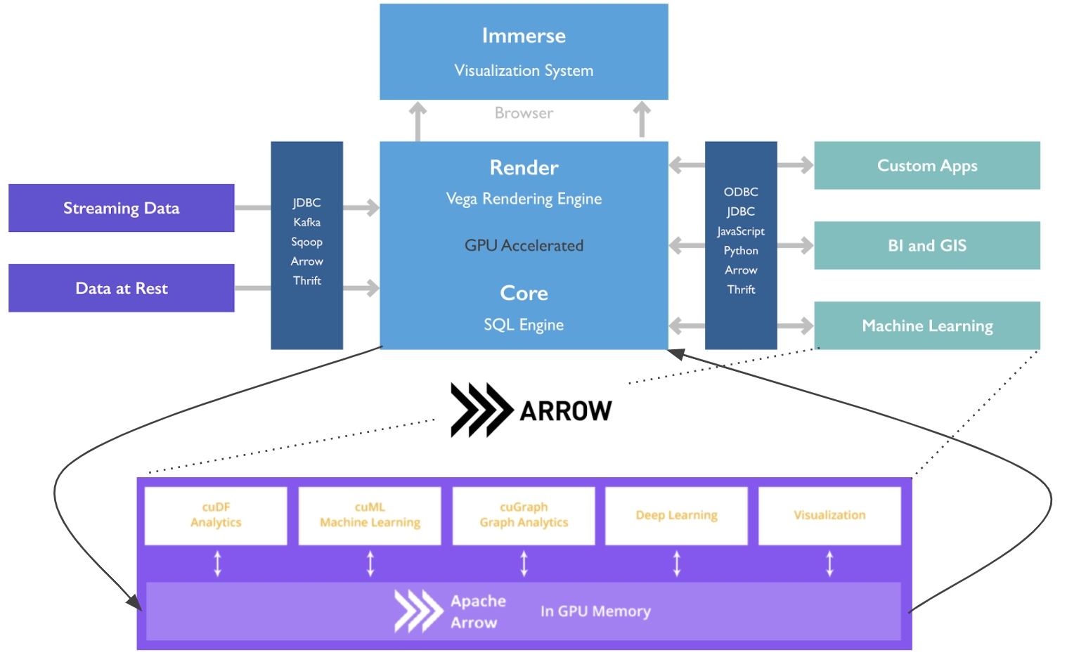 The Nvidia RAPIDs toolkit is a collection of foundational libraries for GPU-accelerated data science and machine learning. It includes popular algorithms for clustering, classification, and linear models, as well as a GPU-based dataframe (cudf). HEAVY.AI allows configurable output to cudf from any query (including via Ibis or pyomnisci), so you can quickly run machine-learning algorithms on top of query results from HEAVY.AI.