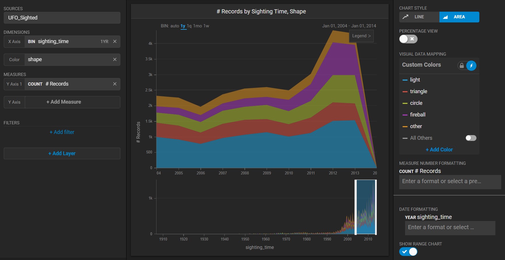 Categorize UFO sightings on the **Dimension** *sighting\_time* and set the **Measure** to the number of records (the number of sightings).