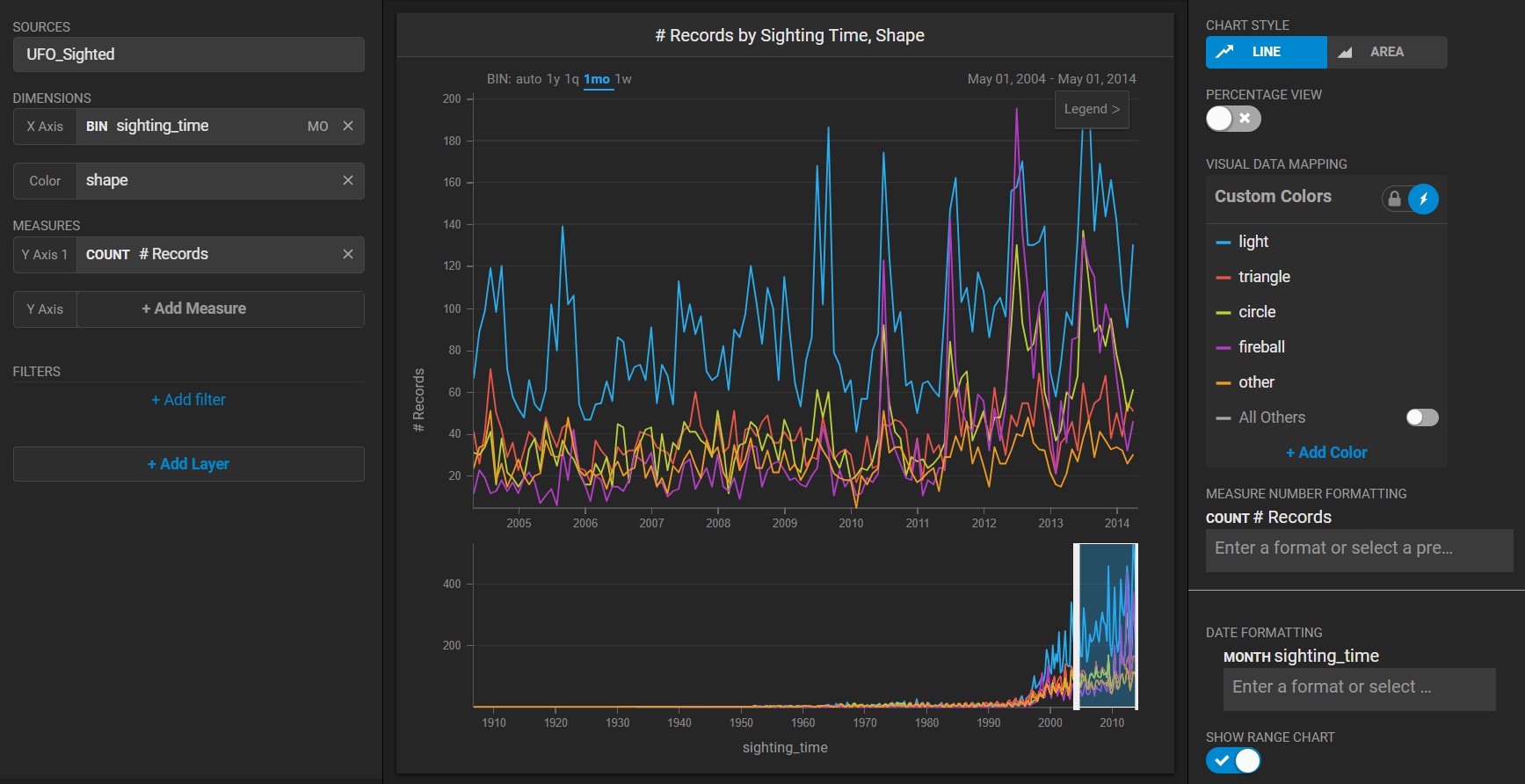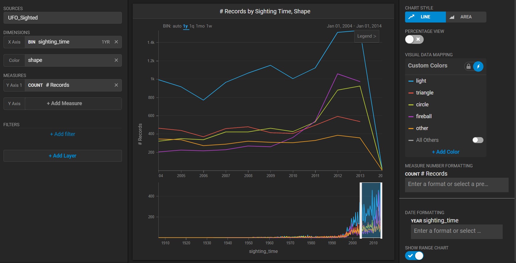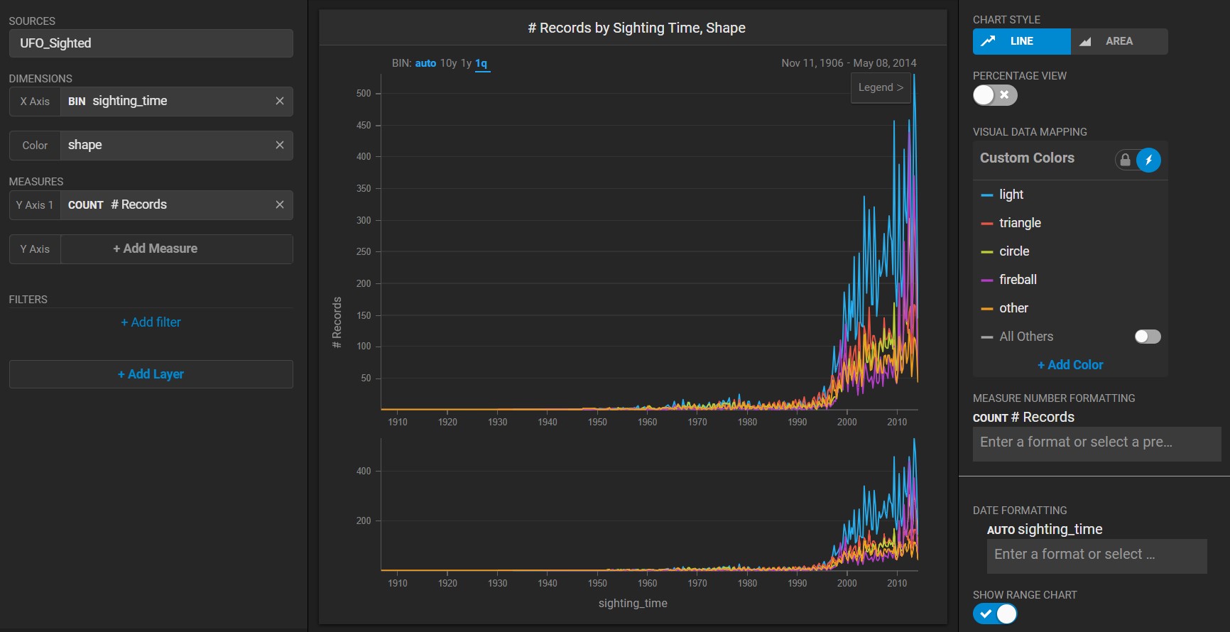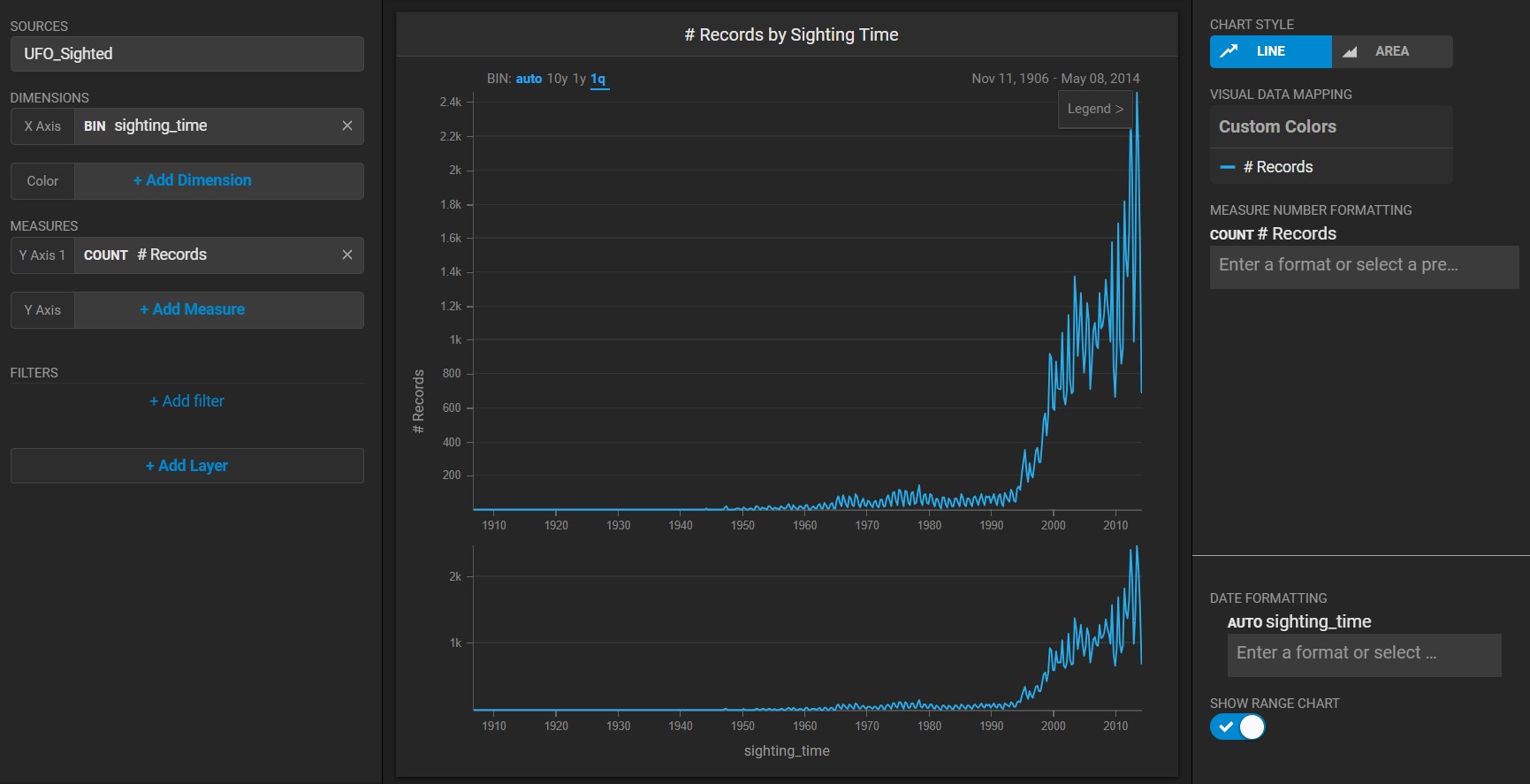 Create a new Line chart. Choose a **Data Source**. This example uses the official database of [UFO sightings](https://github.com/planetsig/ufo-reports/tree/master/csv-data)