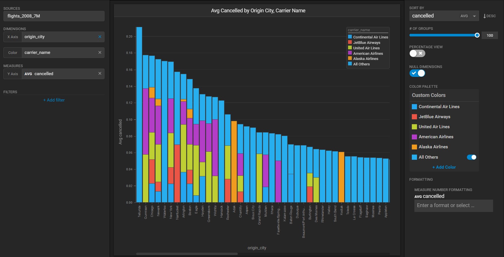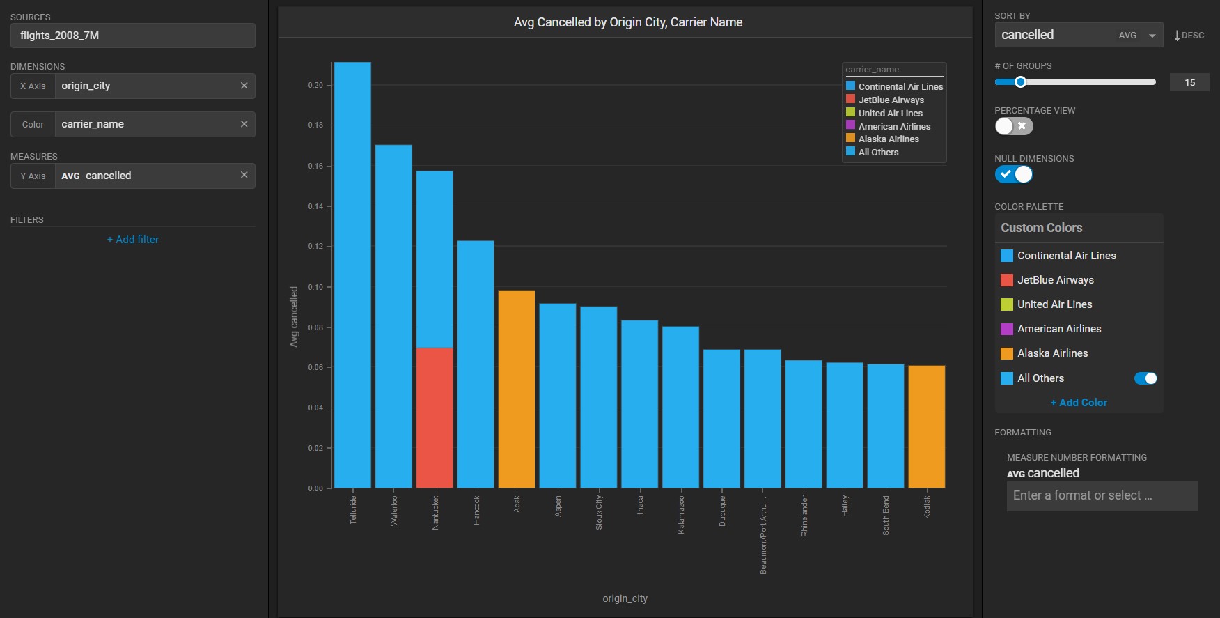 You can reduce the number of cities on the X Axis by sliding the **# of Groups** down (**15** in the next example), and show the value for all other airlines by toggling **All Others** to **On** in the **Color Palette**: