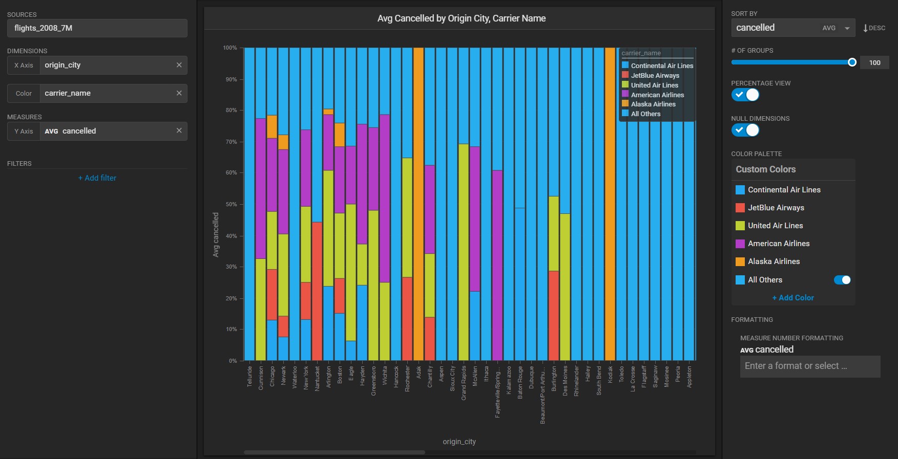 Now, adjust the chart dimensions and measures to see information about cancelled flights for particular origination cities for individual airlines.