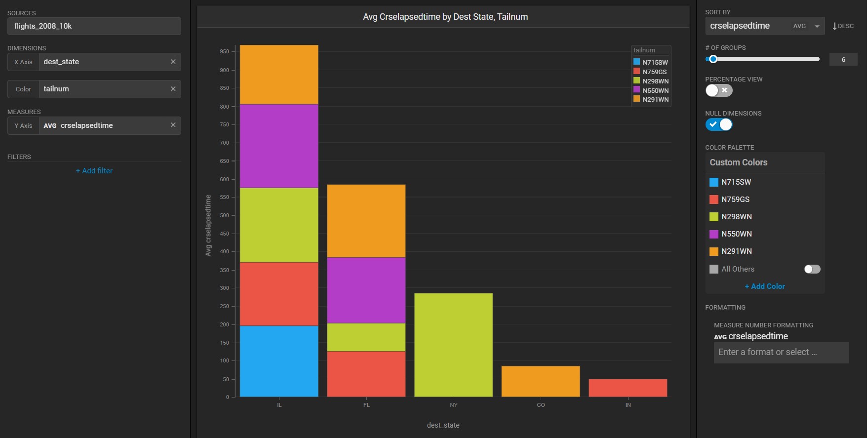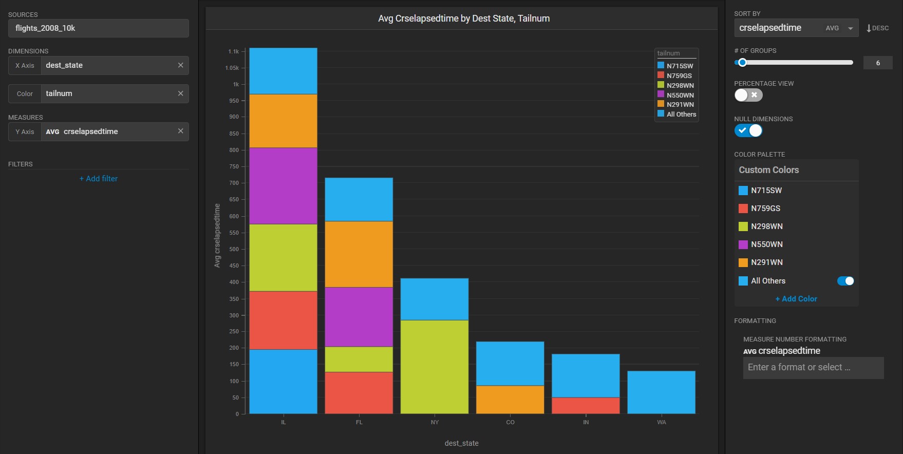 In some cases, if you disable All Others from the color menu, the # of Groups does not match what is shown on the x axis. For example, in the following chart, the number of X axis items for dest\_state is five, but the # of Groups is set to **6**.