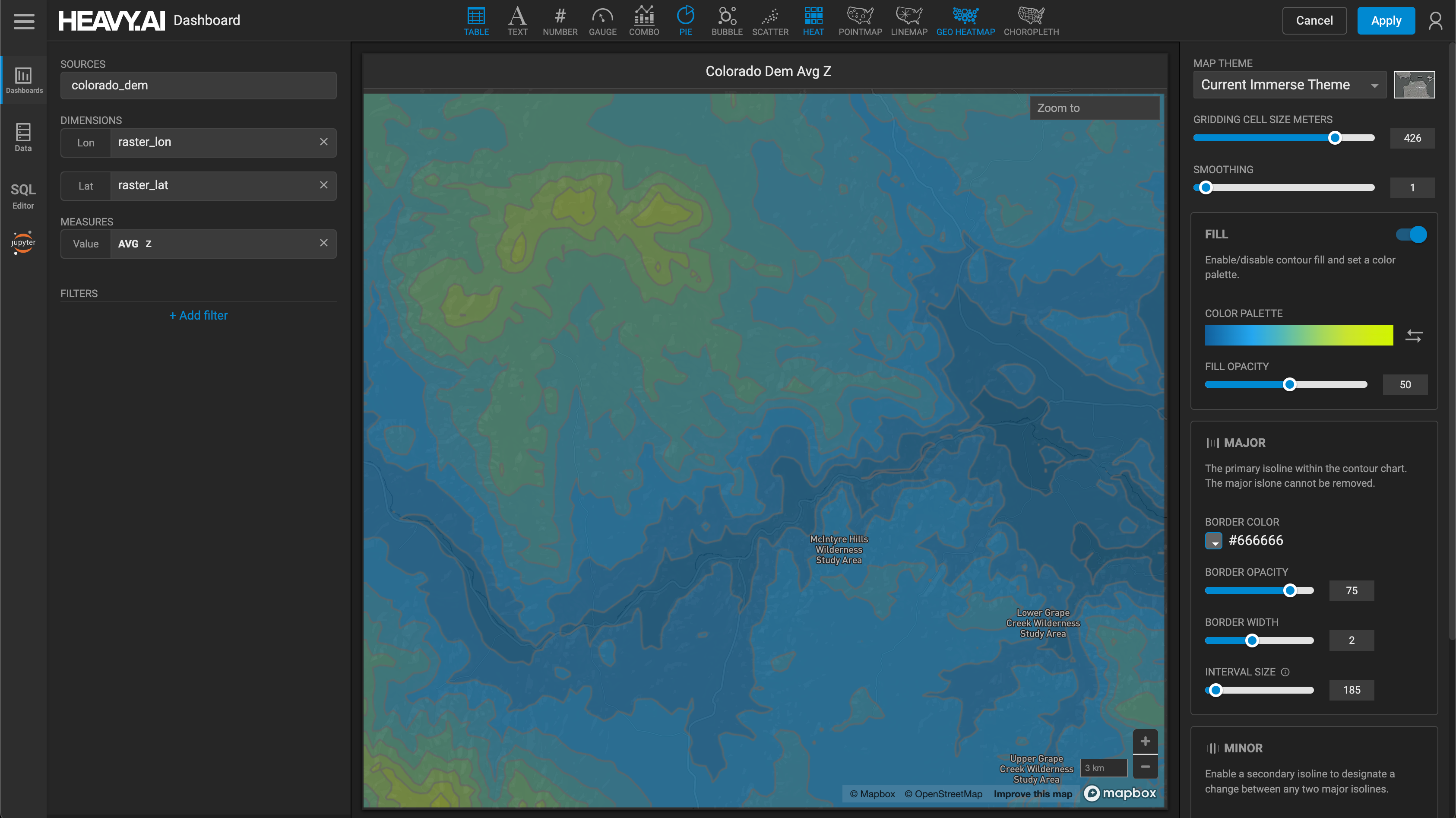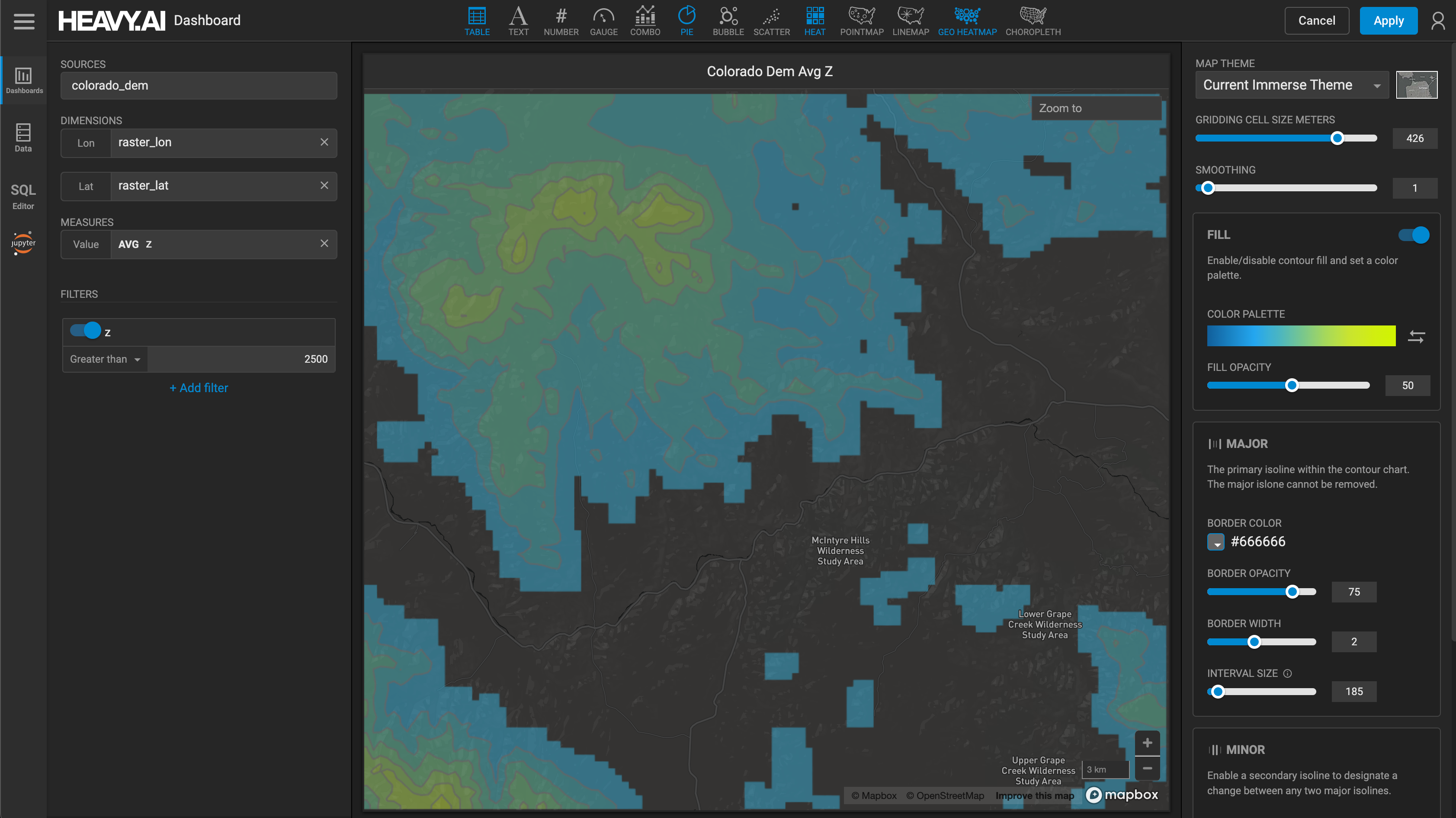 You can apply a filter dimensions and measure values. In this example, the contour map only shows average elevation above 2500 feet (z is greater than 2500):
