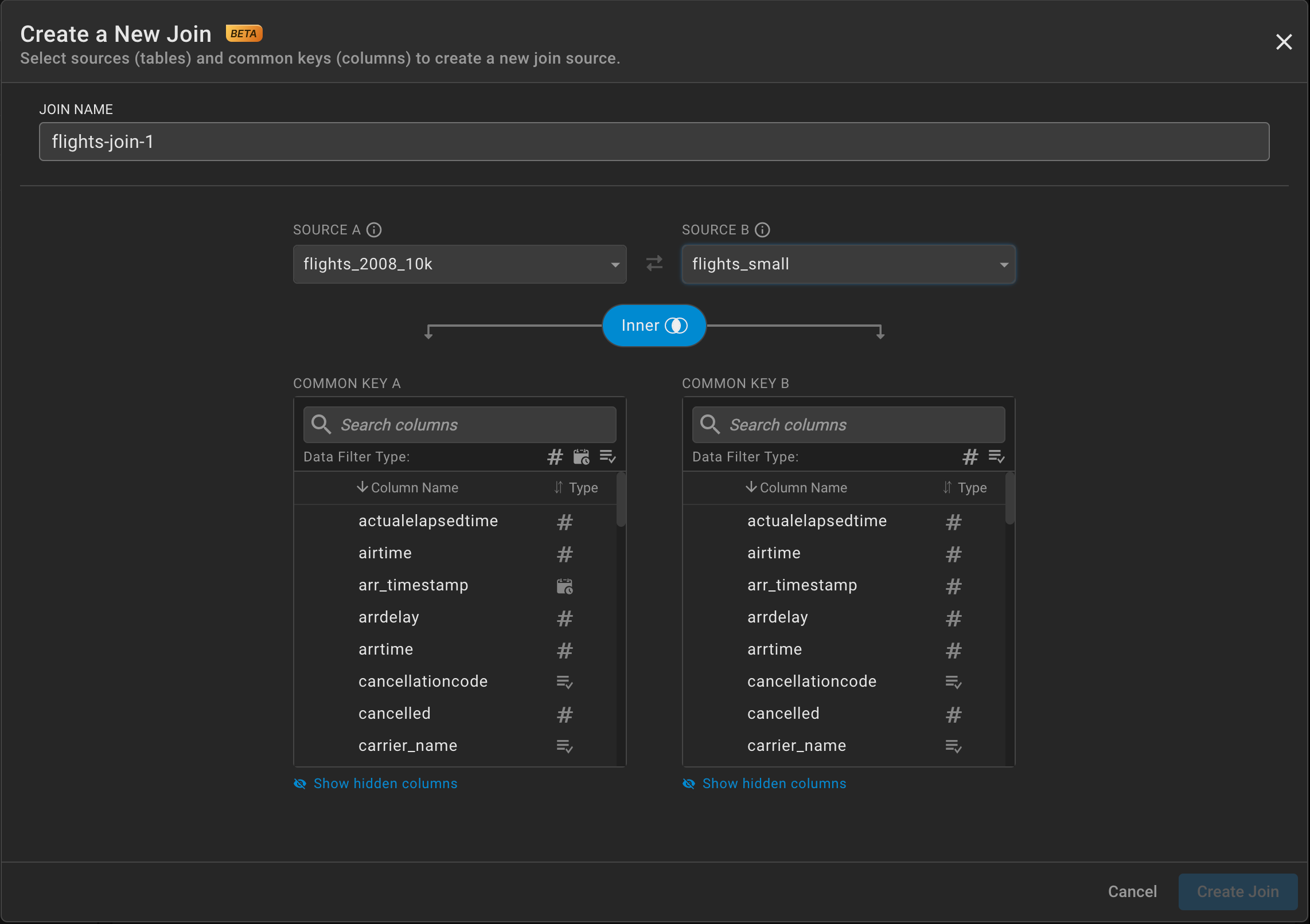 3. In **Create a New Join**, name the join (**flights-join-1**), select the data sources: Source A (**flights\_2008\_10k**) and Source B (**flights\_small**), and select the join type (in this example, **Inner**).