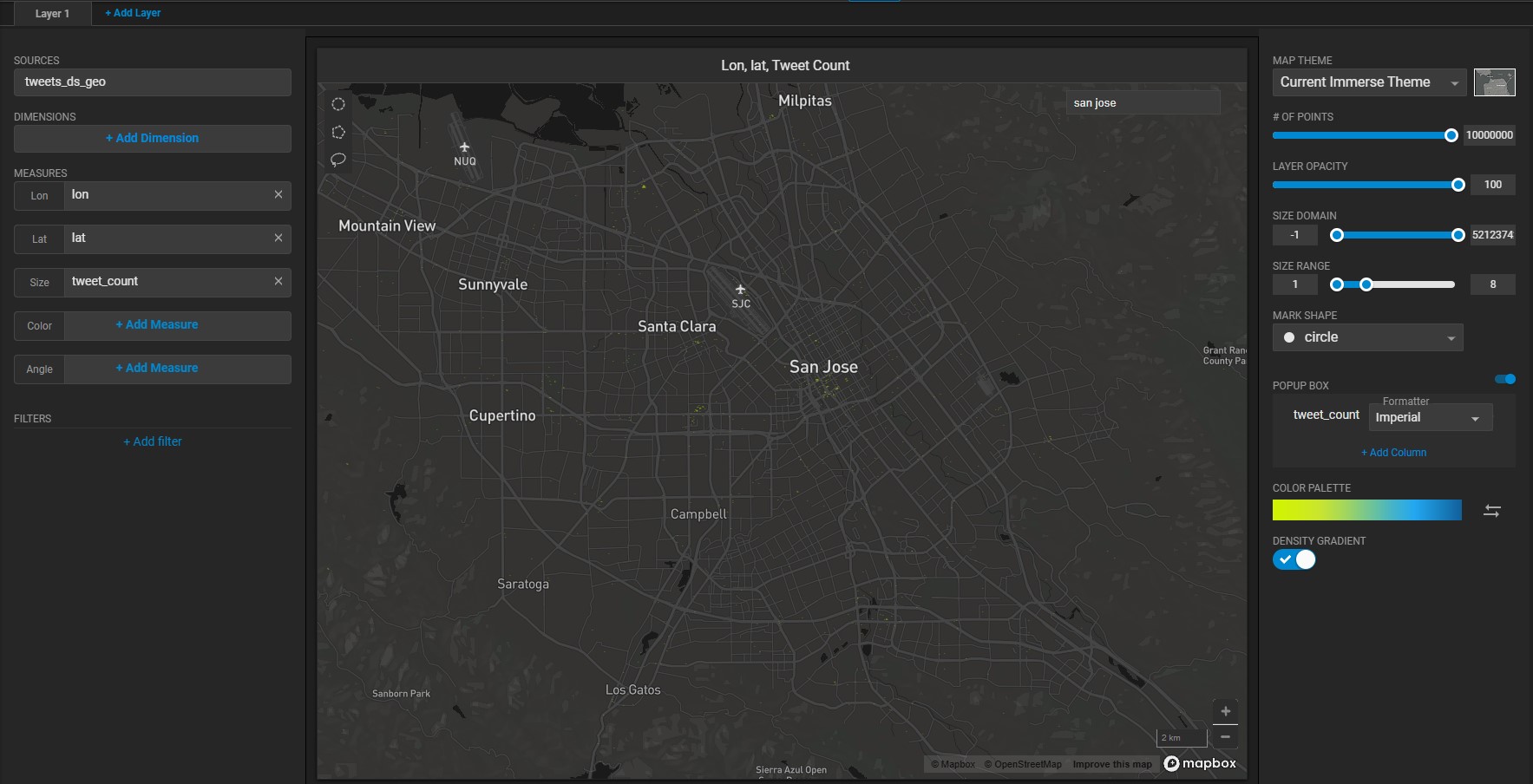 Set the **Lon** measure to *longitude* and **Lat** measure to *latitude*. Set the **Size** measure to *duration\_seconds*.