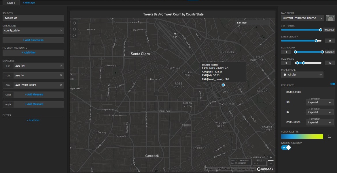 When you add the dimension *county\_state*, the map displays a single point representing the average of all the points in Santa Clara County and the total number of “tweets”. When you hover over the point, a pop-up box shows the average longitude and latitude, with a summary of the results. In the POPUP BOX section on the right side, you can adjust the popup box contents to change the formatting, and you can change the order that the measures appear by dragging them to the desired location in the measures list.