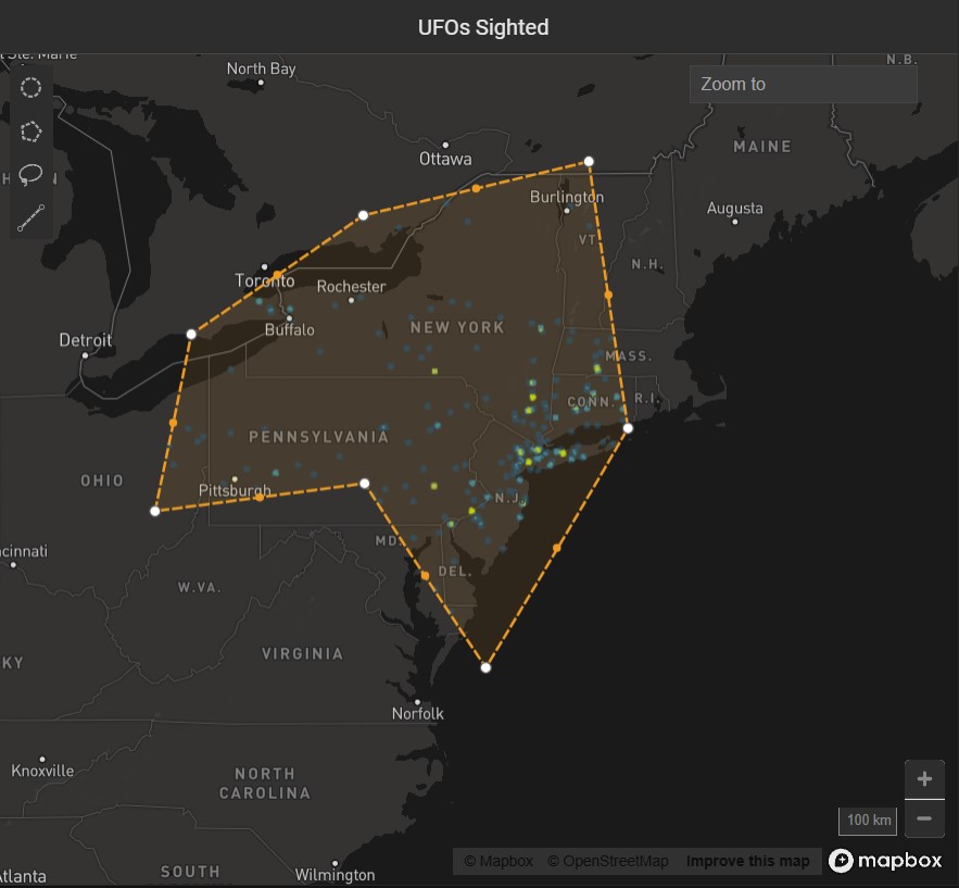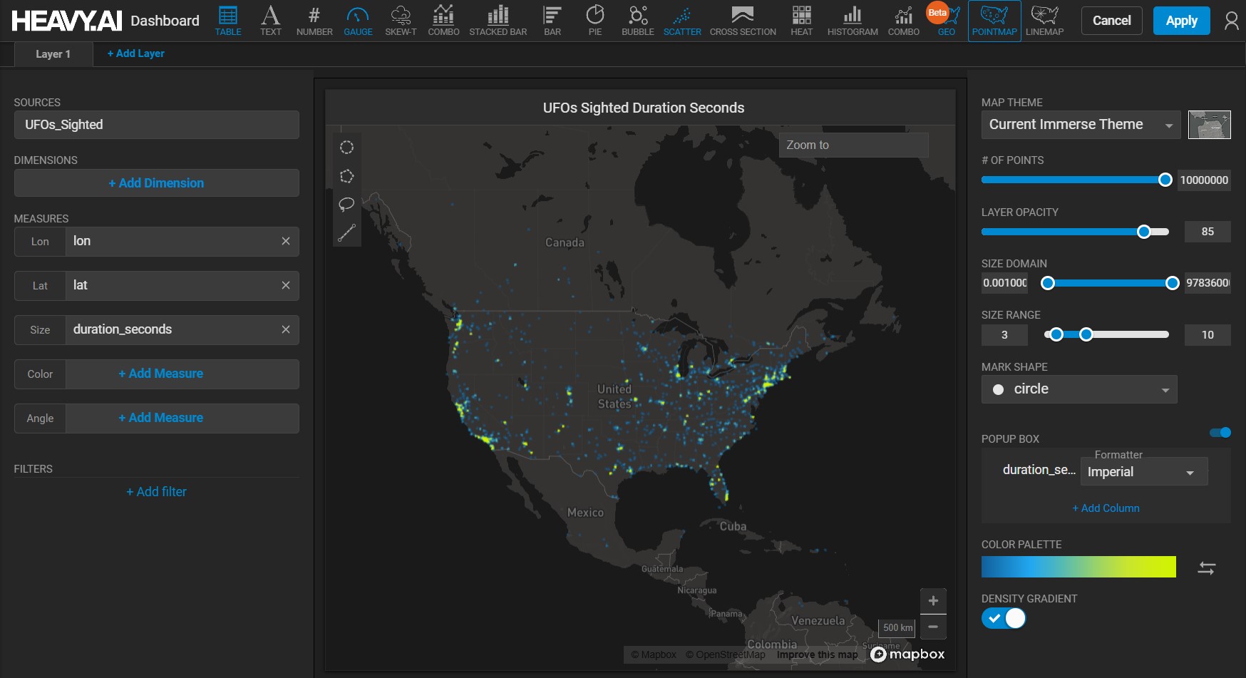 Create a new Pointmap. For the **Data Source**, use the official database of [UFO sightings](https://github.com/planetsig/ufo-reports/tree/master/csv-data).
