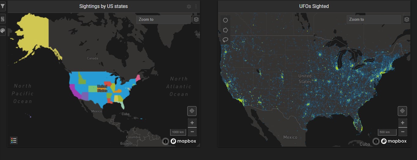 On the dashboard, you can compare the Pointmap, which can display detailed information for each sighting, versus a Choropleth, which displays only aggregate values (for example, total sightings) for a geographic region (for example, a state).